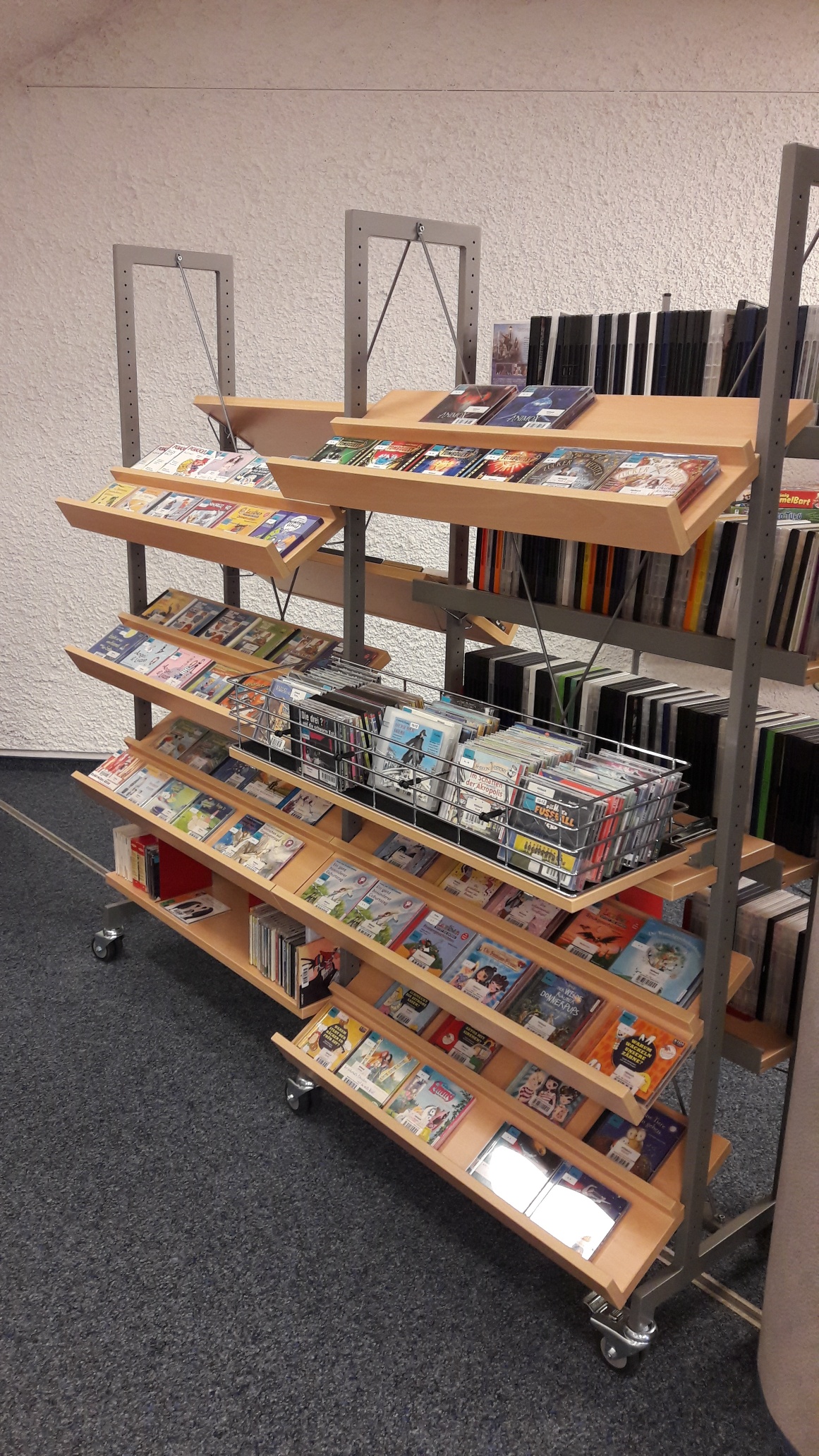 Alle Medien sind mit Aufklebern zu Themenbereich, Altersempfehlung und Buchautor gekennzeichnet.