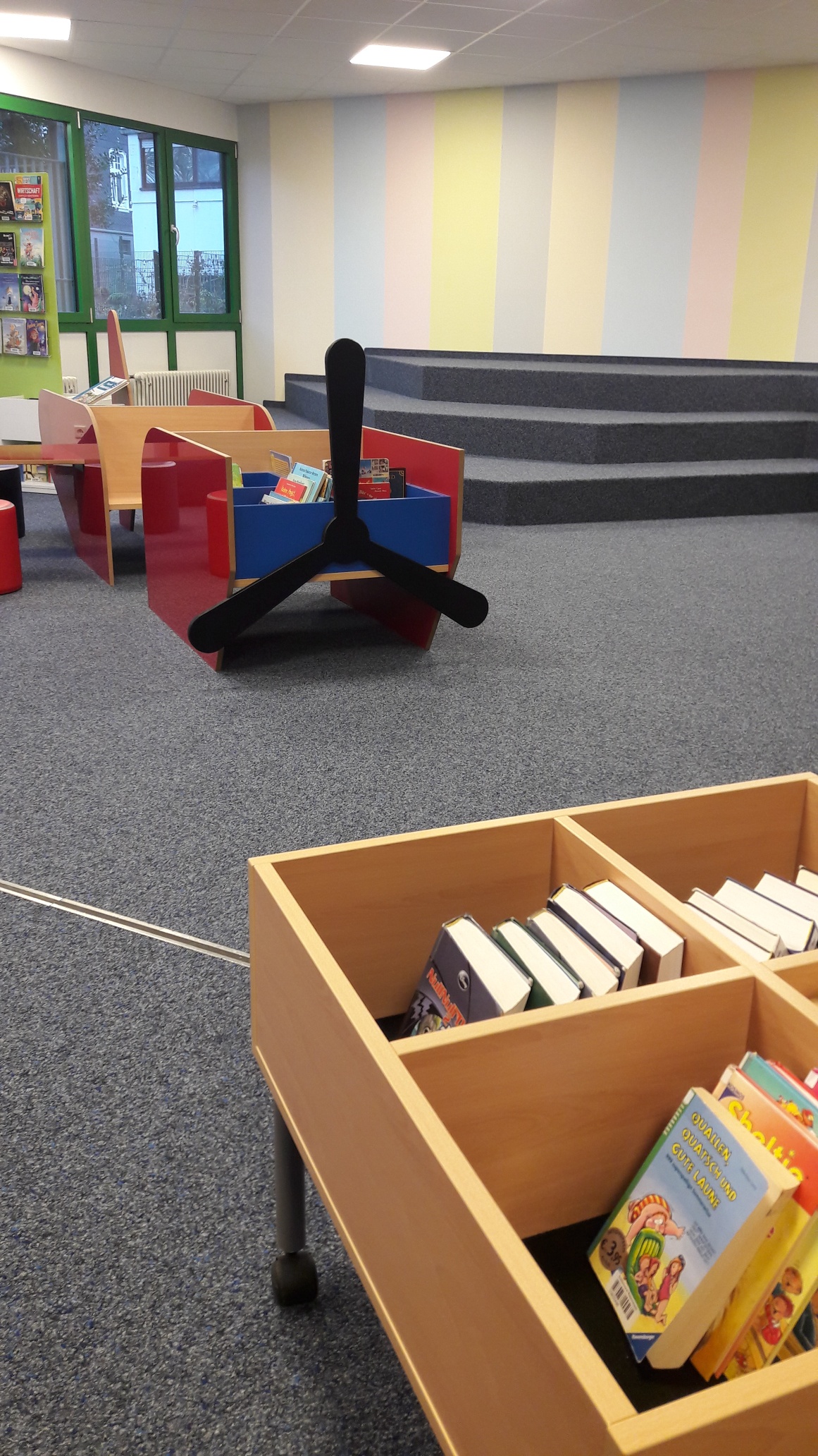 In der Kinderbücherei gibt es eine Sitzlandschaft mit gemütlichen Lese-Plätzen - und Plätze, an denen man Hausarbeiten machen, spielen oder mit Freunden plaudern kann!