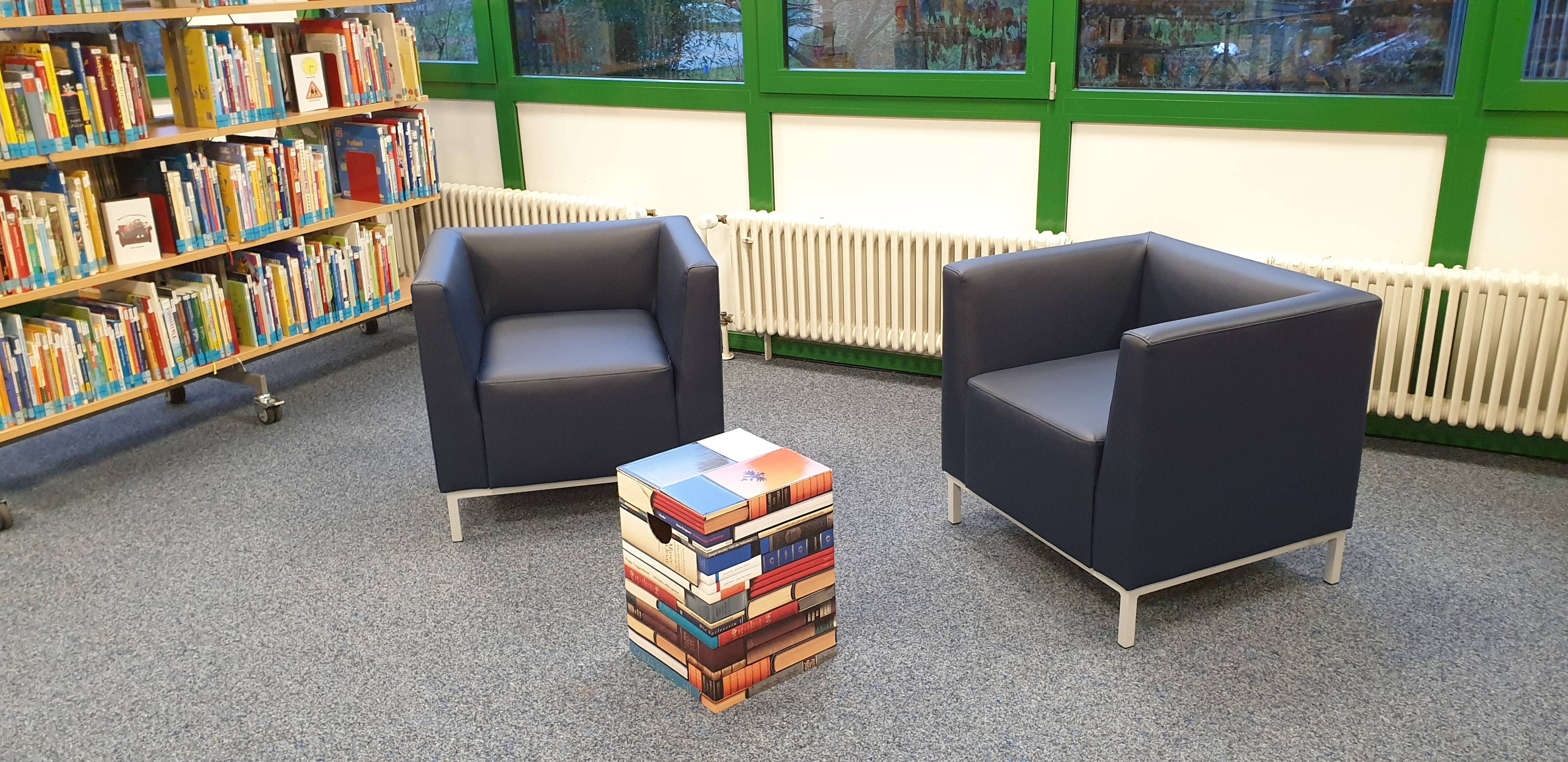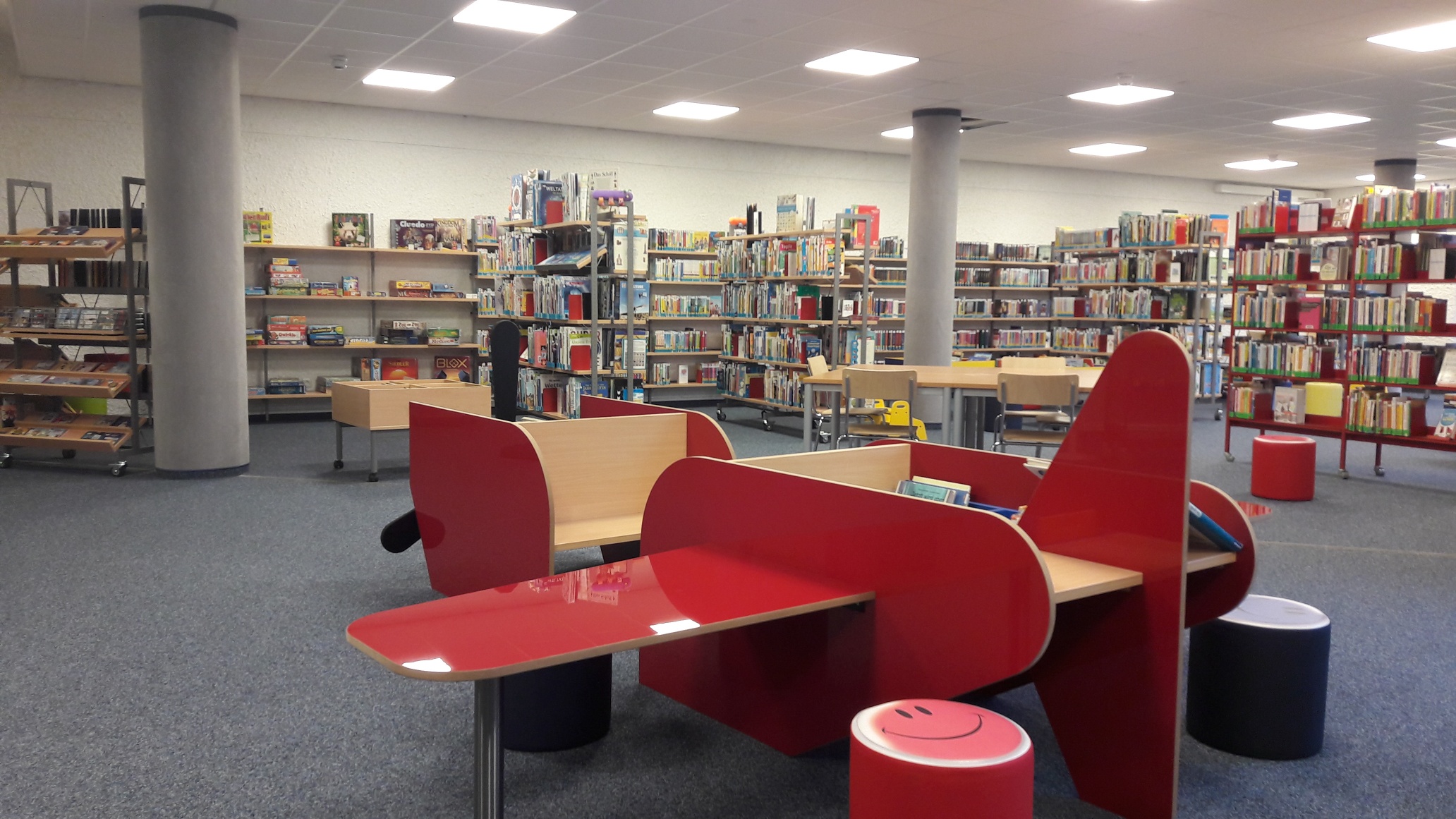 In der Kinderbücherei gibt es eine Sitzlandschaft mit gemütlichen Lese-Plätzen - und Plätze, an denen man Hausarbeiten machen, spielen oder mit Freunden plaudern kann!